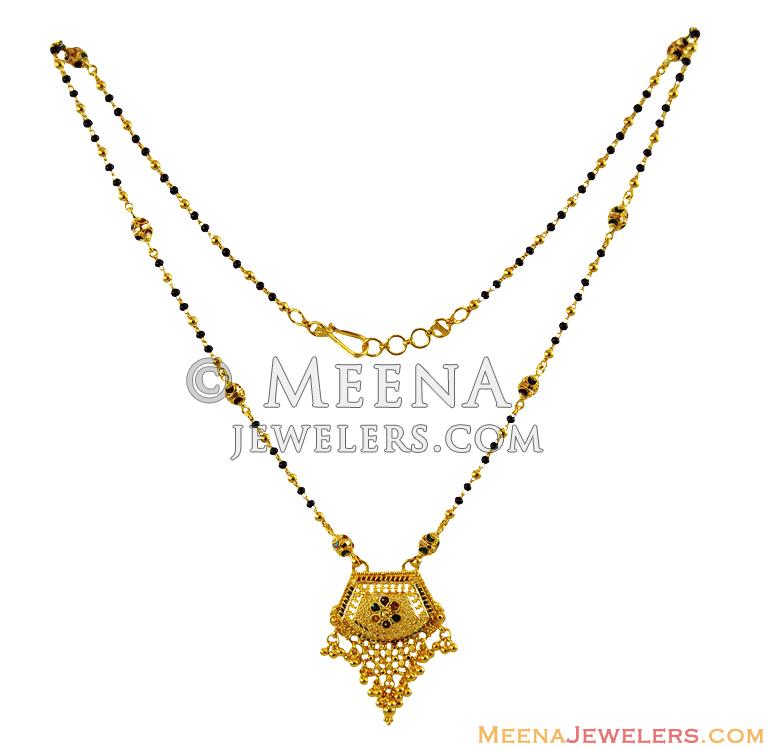 Much more option for gold meenakari mangalsutra chms karat gold Stand out from the crowd with short mangalsutra in gold with intricate designs and black beads. A perfect buy for simple & elegant style. 4. 22K Gold Heavy Weight Mangalsutra. Now is the age to experiment your looks with the numerous options available to you. This traditional mangalsutra is made of 22K gold with black beads attached to the ends.
