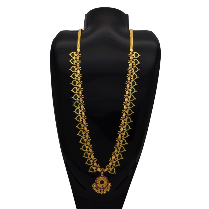 Palakka Mala, Kerala women's favorite jewelry gain a unique place in their adornment on special occasions including weddings. Palakka leaf pattern, inspired by nature is made with Green coloured glass stone in a golden frame give a mesmerizing grace to the wearer.